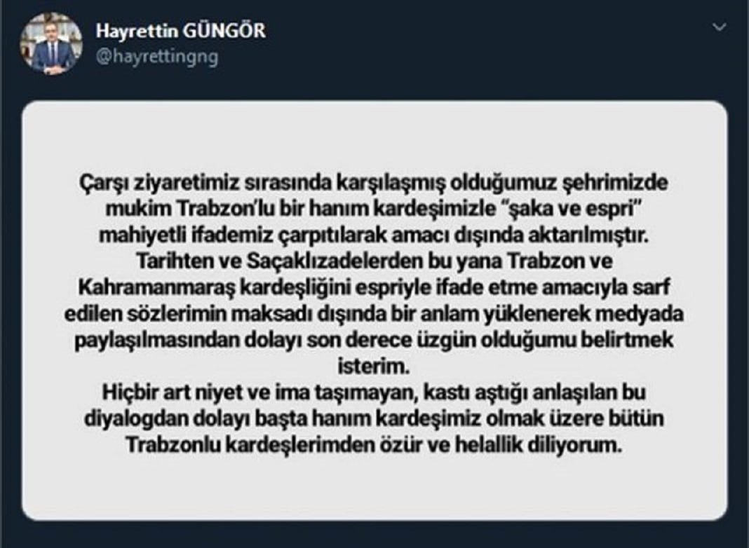 Güngör tepkiler üzerine sosyal medya hesabından özür dilerken Trabzon Büyükşehir Belediye Başkanı Murat Zorluoğlu’nu da aradı. Başkan Zorluoğlu görüşmenin detaylarını, “Kahramanmaraş Büyükşehir Belediye Başkanı eski bir dostumdur. Dün akşam üzgün olduğunu söyledi. Sokakta Trabzonlu bir hemşehrimizle boş bulunduğunu maksadını aşan sözler söylediğini ifade etti ve özür diledi. O da eksiğini hatasını gördü, bazen biz de böyle hatalara düşebiliyoruz.