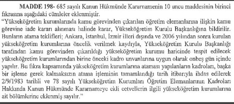 Yayımlanan yeni KHK ile ihraç edilen akademisyenlerin görevlerine iade edilmesi durumunda, ihraç edildikleri kurum dışındaki bir yerde görevlendirilmesine karar verildi.