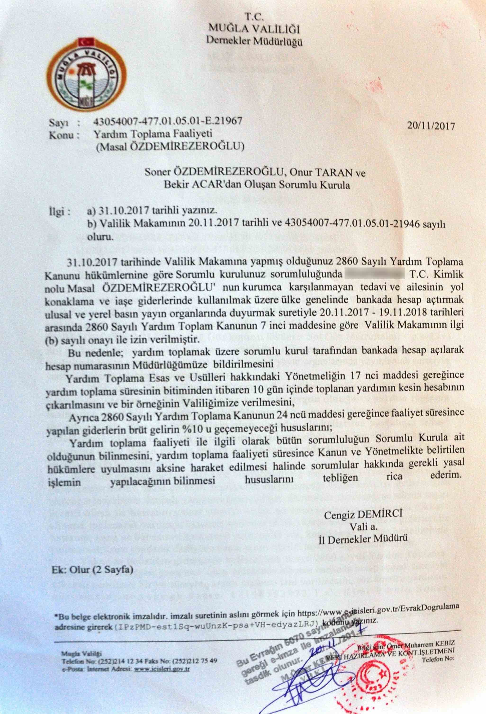 Bebeğin sağlığına kavuşması için Muğla Valiliği’nden yardım toplama izninin alındığını ifade eden 29 yaşındaki anne Mirgül Kalbeeva, “Masal bebeği dört aylıkken yapılan haberlerle tüm Türkiye tanıdı. Bu süreçten sonra biz yardım kampanyası için Marmaris Kaymakamlığına başvuru yaptık. Yardım kampanyasının bir an önce başlaması için AK Parti Muğla Milletvekili Nihat Öztürk bu yardım kampanyası izninin bir an önce çıkmasını hızlandırdı. Artık yardım toplamak için iznimiz çıktı. Şu an Masal bebeğimiz adına bankada hesabımız açıldı. Tüm hayırsever vatandaşlarımızdan Masalımızın sağlığına kavuşması için yardım bekliyoruz” dedi.