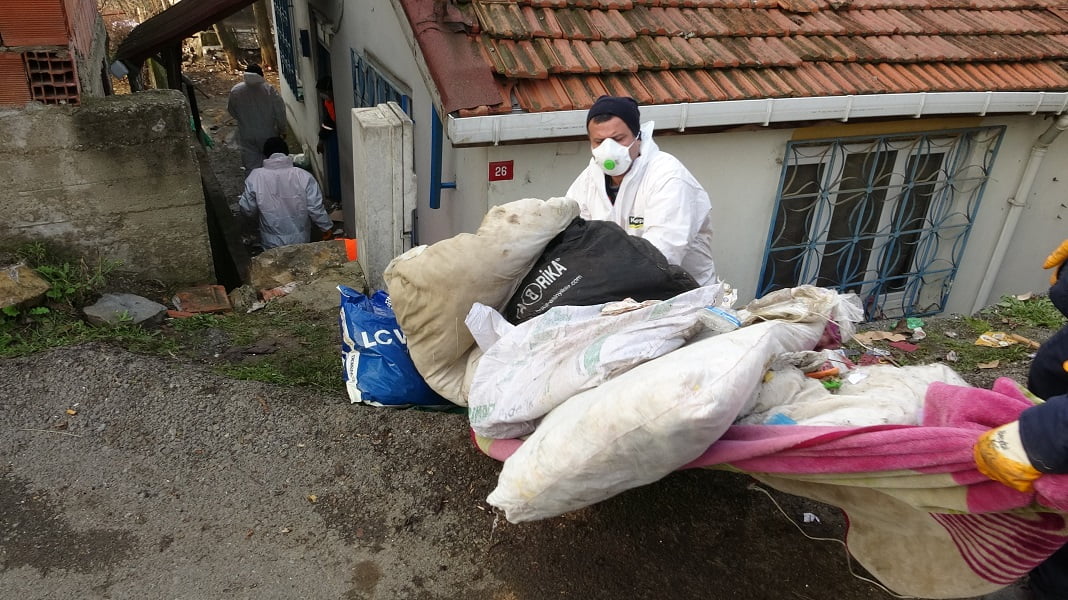 Ev ve bahçesinden yaklaşık 20 ton çöp çıkarıldı. Kamyon kamyon çöp çıkarılan evde dezenfekte çalışmaları başlatıldı. Zabıta ve temizlik ekiplerinin saatlerce süren çöpleri toplama işlemi ise havadan görüntülendi.