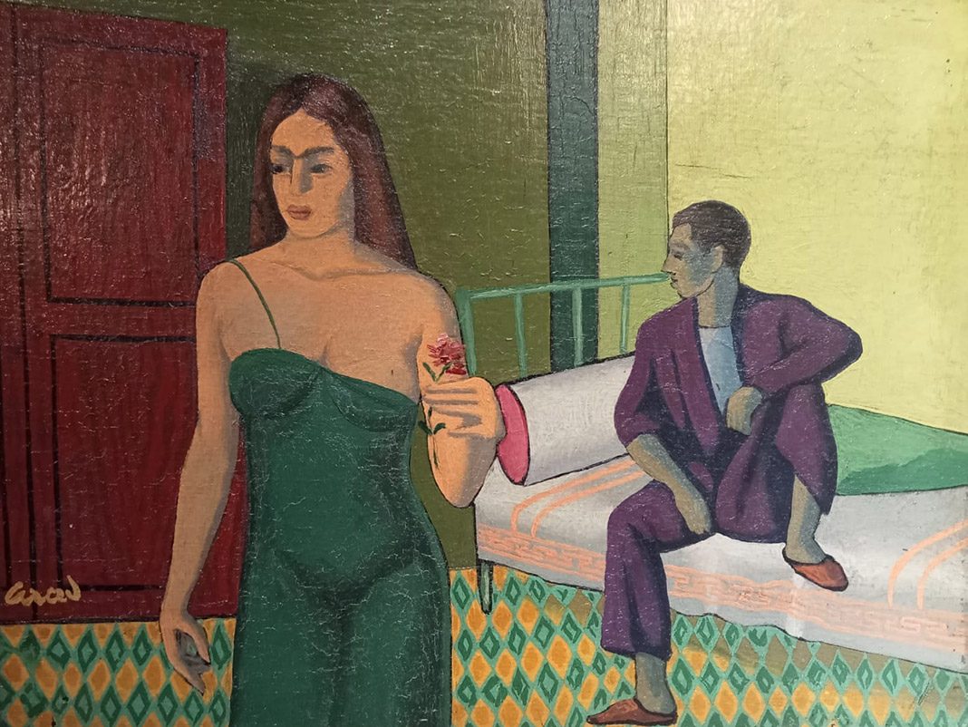 Bu bilinmeyen aşkı tuvale yansıtan Agop Arad’dır, varsayımıyla devam edelim. Yalın döşenmiş odada kadın ve delikanlı birlikteler. Ancak bu birliktelik fiziksel. Zihinsel olarak delikanlı bambaşka bir yerde. Belki yaşadığı çıkışsız aşkı nihayetlendirmek peşinde. Kadın, delikanlıya sırtını dönmüş. Elindeki pembe sümbülle, delikanlının kendisinde uyandırmaya başladığı duygunun seline kapılmış gibi. Ancak pembe sümbül bu hislerin faciayla sonuçlanacağını, sevgililerden birinin ağlayacağını söylüyor.