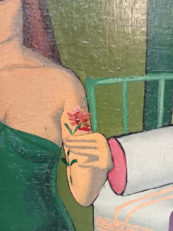 Duvarın, zemin döşemesinin yeşili ile kadının elbisesinin yeşili uyum içindedir. Kadın bağlamdan ayrı değil, mekânın bir parçası gibi. Bu ortamda ayrıksı duran, yarı oturur yarı kalkar durumdaki adam ve kadının elinde tuttuğu pembe sümbül. Adamın beden dili, gitmek üzere hamle yapan, öte yandan kalmak isteyen bir eşiği ifade eder. Bu kararsız duruşa kadın arkasını dönmüş, elinde sümbülle yaşadığı duyguya odaklanmıştır. Bir seks işçisiyle ona sevdalanan bir adamın imkânsız aşkıdır söz konusu olan.