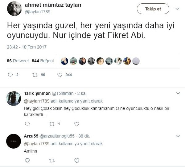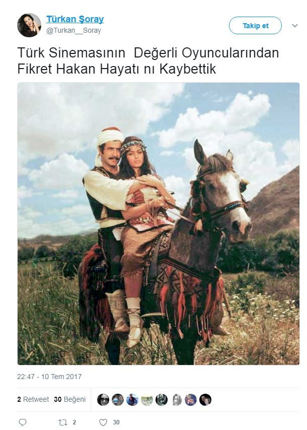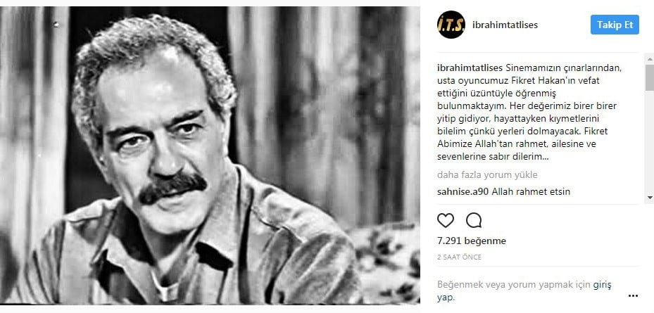 Ünlü sinema oyuncusu Fikret Hakan’ın ölüm haberinin duyulması üzerine ünlüler sosyal medya hesaplarından taziye mesajları yayınladı.