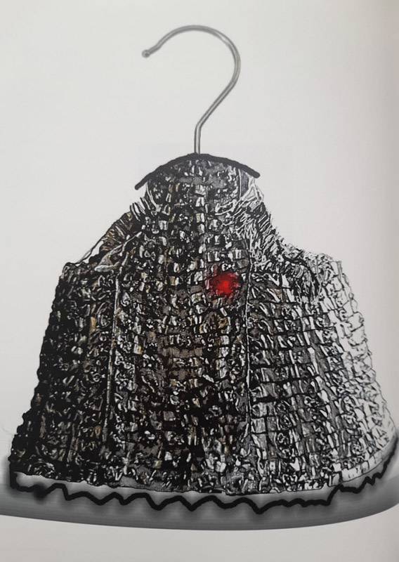 Öykünün plastik dille ifadesinde Alkor, simge elbiseyi büyük başlı bir askıya takar. Gümüş pırıltıların ortasında kan lekesi gözle görülebilecek denli büyüktür. Elbiseyi giyen kişi elbisenin ruhuna bürünür. Giacinta’yı temsil eden mask, karnaval makyajıyla süslü ve güzeldir. Alnından kaşlarının ortasına doğru sarı bir yıldız sarkmaktadır. Giglio ise her ne kadar kendisini yetenekli bir oyuncu olarak görse de bir soytarıdan fazlası değildir. Oyuncu formunun baş kısmına yapılan soytarı şapkasıyla Alkor bunu anlatır. Kişinin kendisini nasıl gördüğü ve aslında nasıl biri olduğu saydam tuş alanlarıyla ifade edilir. Ayrıca göğüs kafesinden taşan kırmızı neon renkli kalp Giglio’nun hissettiği aşkın büyüklüğünü ve yönlendirici etkisini anlatır.