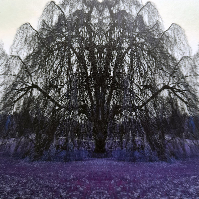 Bilge Alkor “Altın Saksı” masalı için yaptığı çalışmada mürver ağacı ile Anselmus’u yan yana getirmiştir. Ağacın köklerinin bağlı olduğu toprağın yüzeyi mor çiçeklerle kaplanmıştır. Yapraksız ağacın gövdesi griden siyaha dönen renk alanıyla yansıtılmıştır. İki mürver ağacının ortasında Anselmus yeşil giysili ahşap bir kukla formundadır.